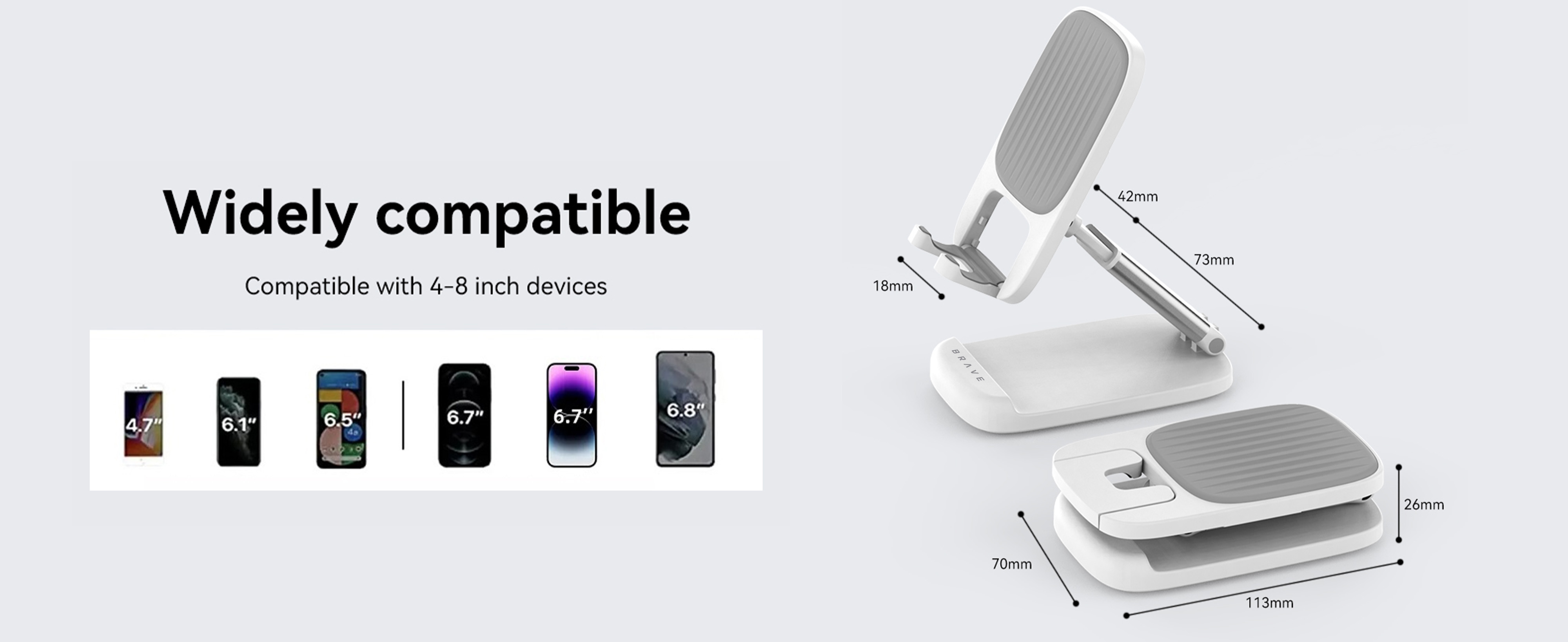 Experience hands-free convenience with the BRAVE 2-in-1 Foldable Phone & Tablet Stand BCS-01. Designed for phones and tablets from 4–8 inches, it provides adjustable height and angle for the perfect viewing experience. The weighted metal base ensures stability, while anti-slip silicone padding prevents scratches. Foldable, portable, and durable, this stand is ideal for desks, travel, home, and work, making it the perfect accessory for students, professionals, and travelers. Compatible with iPhone, Samsung Galaxy, iPad Mini, Google Pixel, Xiaomi, OnePlus, and more.